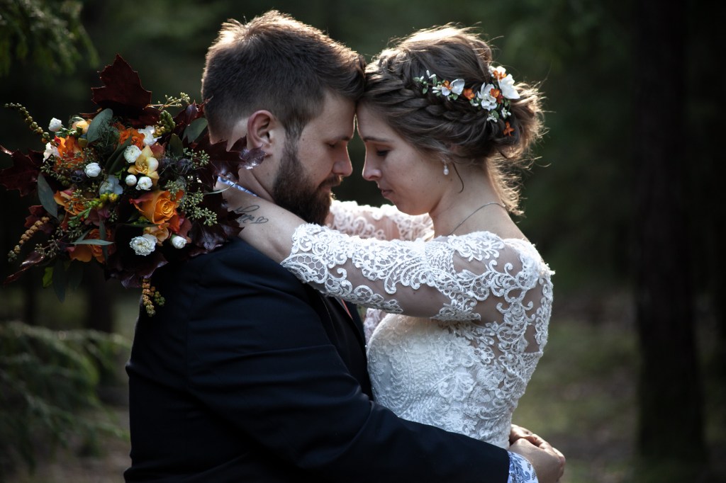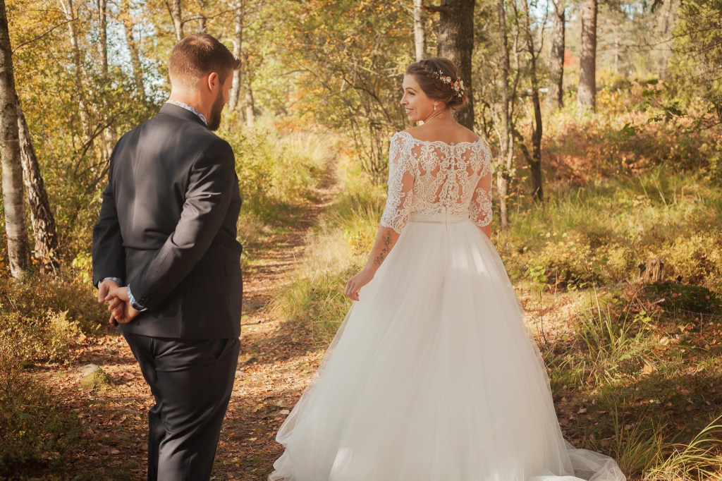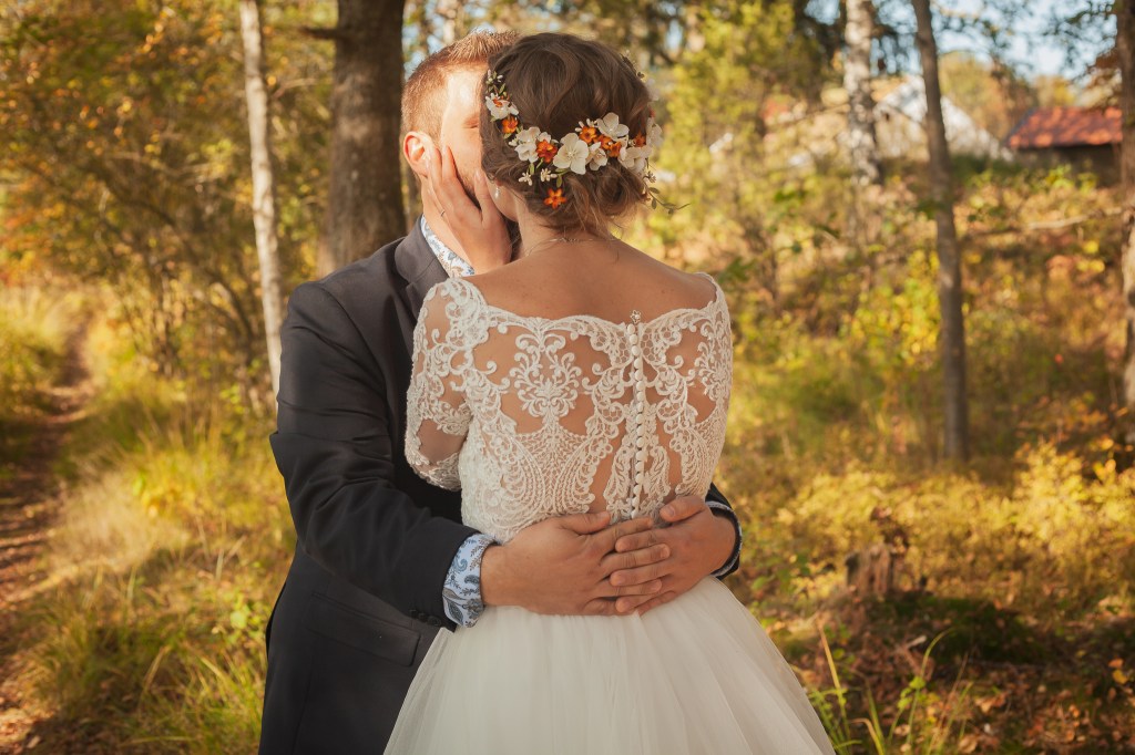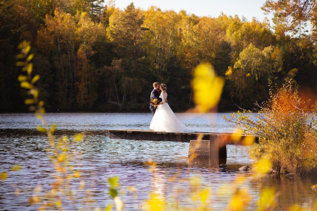 Ingen vågade väl drömma om att få en solig lördag under kalla oktober. I alla fall inte bruden, som i förebyggande syfte hade övertygat sig själv om att regn faktiskt är fint på bild, kanske till och med finare än klart väder. Men vilken dag det blev. Visst, regn är vackert, mysigt och magiskt, men vi hade aldrig kunnat ta vår promenad längs med sjön som vi gjorde den dagen ifall det regnade. Vi hade aldrig kunnat få några bilder på bryggorna, bland björkarna eller i den djupa tallskogen. Så tack vädret, du gav oss en annan sorts magi ♡